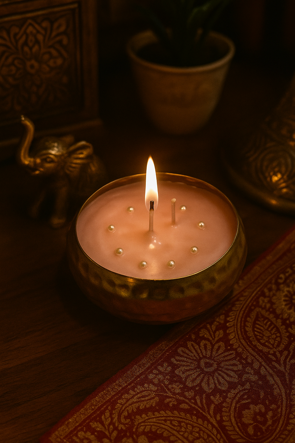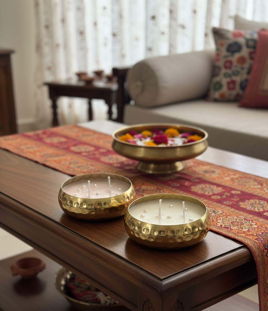 This small round urli candle is filled with natural soy wax for a clean, long‑lasting burn. Choose from fragrances like lavender, cinnamon, eucalyptus or citrus to suit your mood. Its pearled surface and minimal design make it versatile – place it on a coffee table, bathroom tray or as part of a festive rangoli. After the candle has melted, repurpose the urli to float flowers or store jewellery.